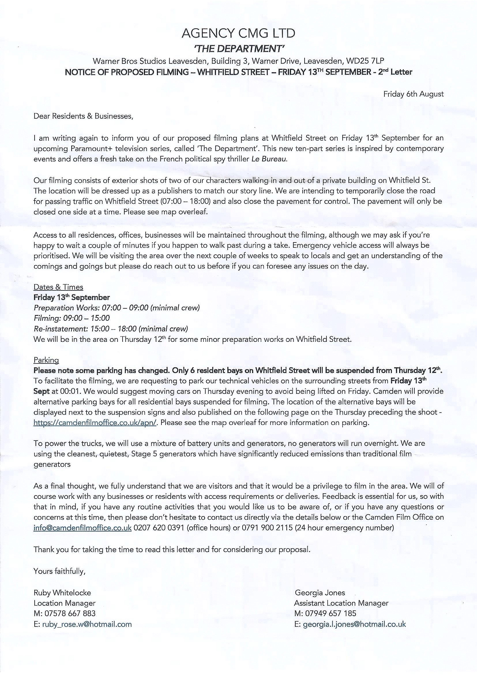 “The story follows the daily lives and missions of CIA and MI6 members, focussing on an American intelligence officer who is mysteriously recalled to London after years abroad,” states the letter sent to residents and businesses.